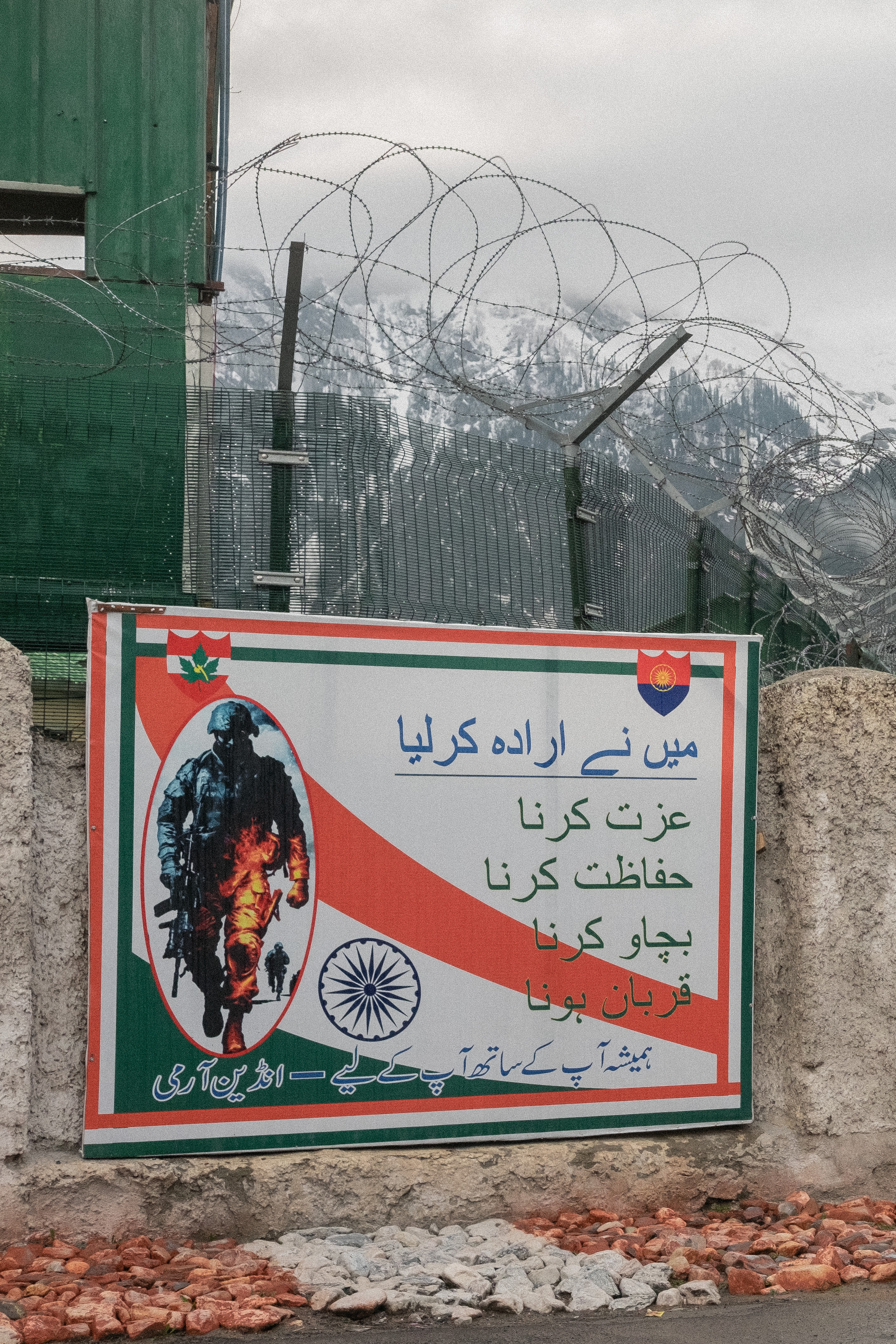 Cartel enaltece los valores nacionalistas del ejército Indio en idioma urdu, Sonamarg, Kashmir